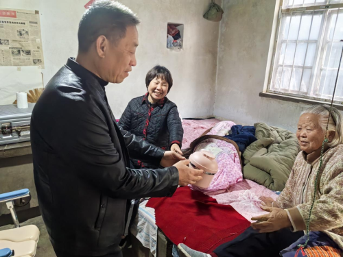 考虑到村里一位93岁老太太行动不便,无法到现场参与活动,史现顺书记特意带着保暖快餐杯和一份特精面粉,亲自登门看望。他握着老人的手唠家常,叮嘱老人注意保暖,让老人足不出户也感受到了节日的温暖与关怀。