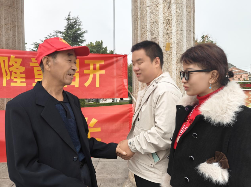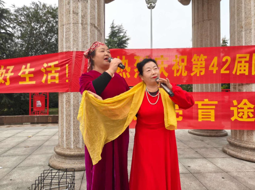 在永年区的太极广场,慰问队伍为残疾人带来的精彩文艺演出,吸引了许多过往群众,大家纷纷鼓掌点赞,豫剧,”五世请缨,朝阳沟”的唱法让现场喜上眉梢,满面春风,展现出视障人士和观众朋友直观快乐神情。歌曲,”五星红旗,滏阳河水绕邯郸”,让视障朋友和现场观众喜气洋洋,兴高采烈,现场的人们愉悦的情绪表现出了热烈迸发的场景。