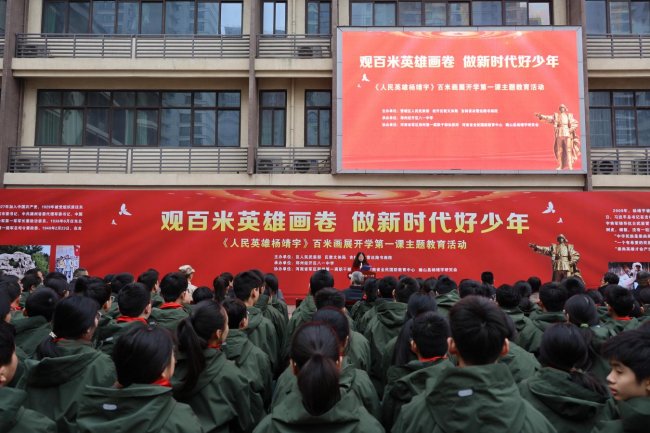 上午9时30分,以“观百米英雄画卷,做新时代好少年”为主题的开学第一课教育活动正式拉开帷幕。这幅凝聚着艺术家心血的巨作,连同英雄后人的深情讲述,为全校师生上了一堂震撼心灵的爱国主义教育课。