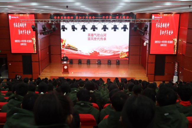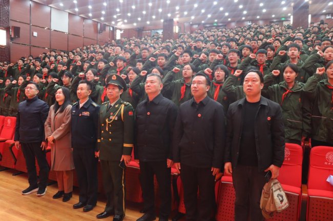 讲座尾声,全体学生肃然起立,高举右拳,以青春之名庄严宣誓。誓言如惊雷滚过长空,在报告厅内久久回响。这一刻,少年的热血与英雄的浩气交汇奔涌,化作新时代最响亮的回答。