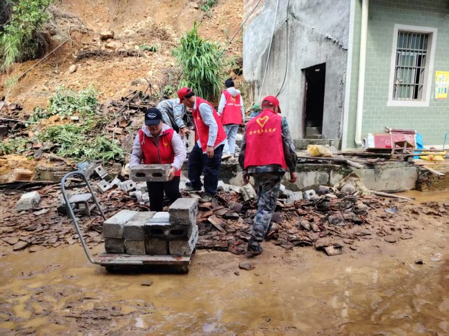 金钟山乡乌冲村第一书记陈彩兰与志愿者为群众搬运物资